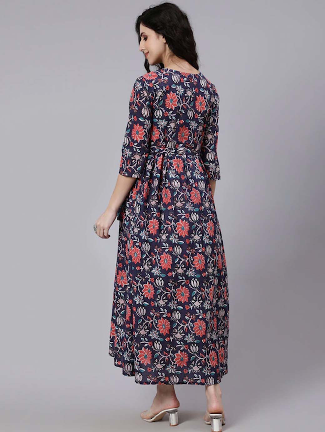 Blue floral print maxi dress Round neck Three-quarter, regular sleeves Maxi length in flared hem Cotton fabric Concealed zip closure