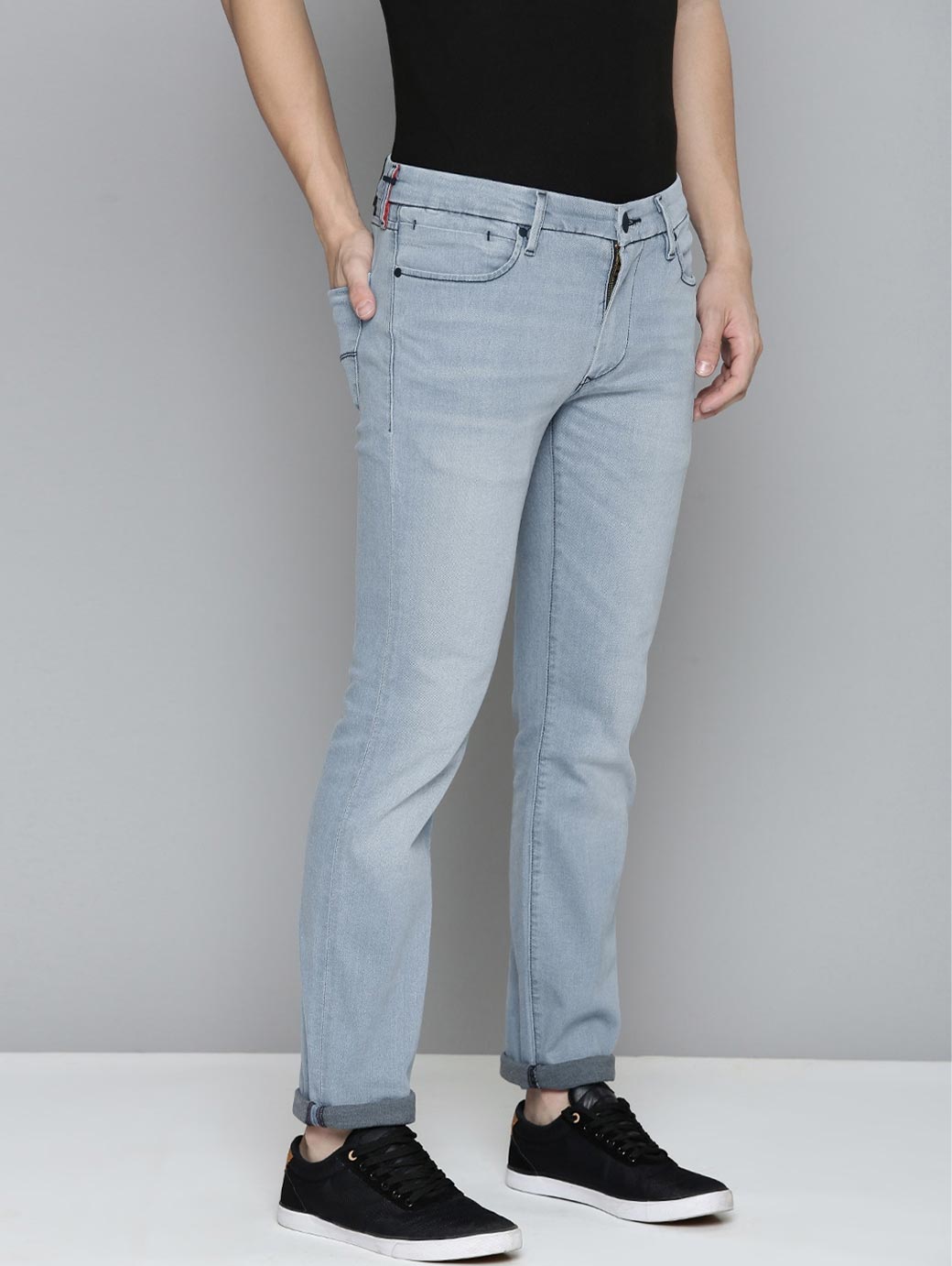 - Slim fit, mid-rise