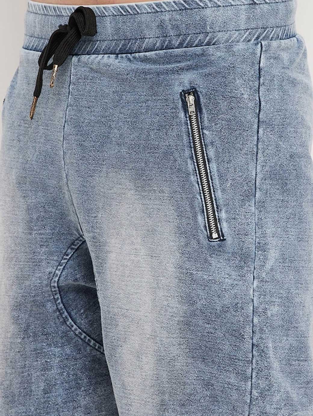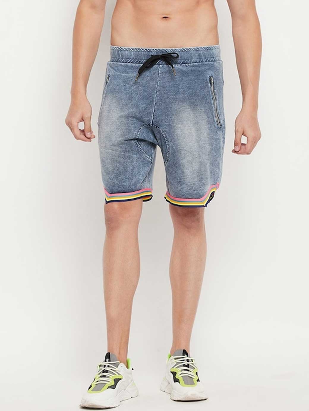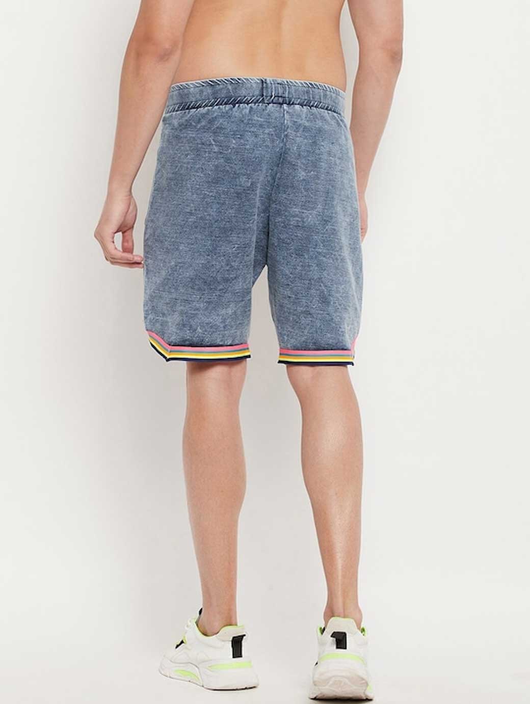 Blue washed mid-rise denim shorts, has 2 pockets, drawstring closure