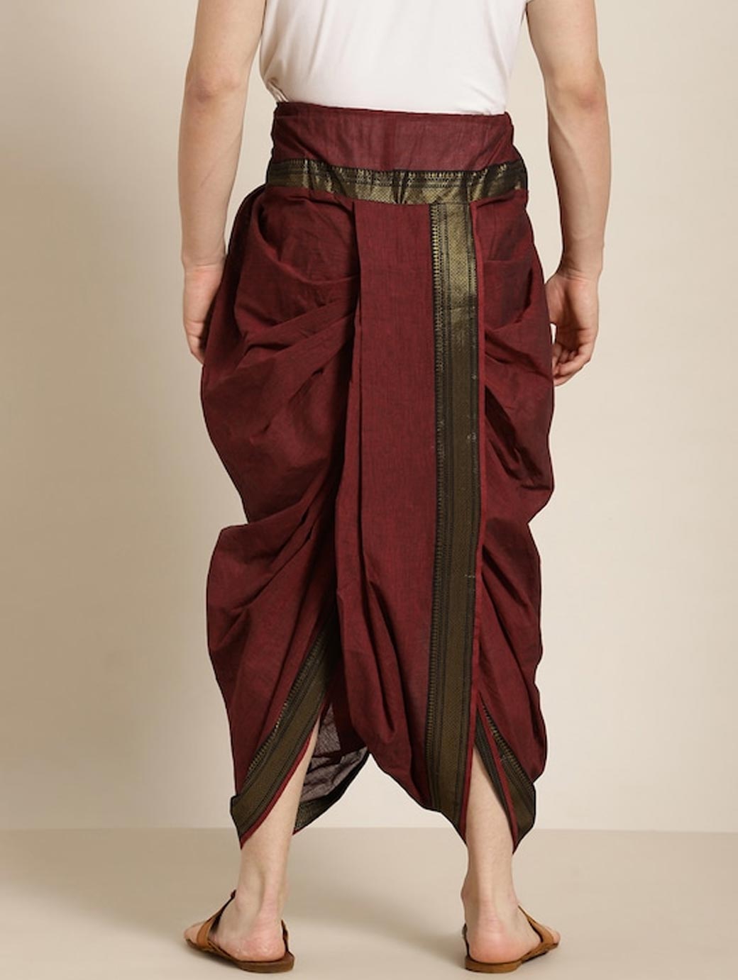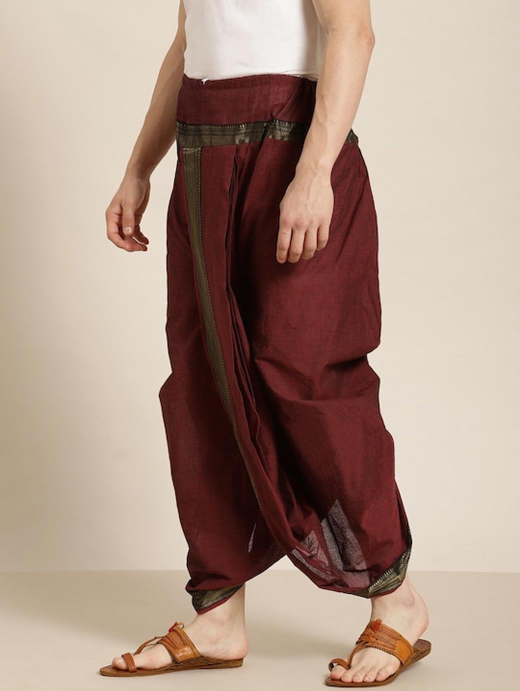 Burgundy solid dhoti pants with border detail, has a drawstring closure