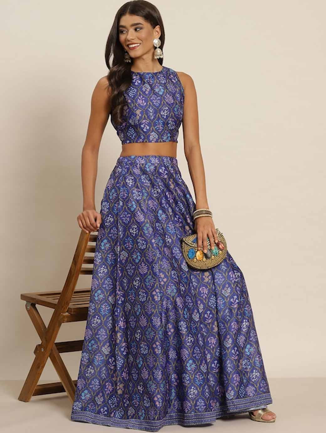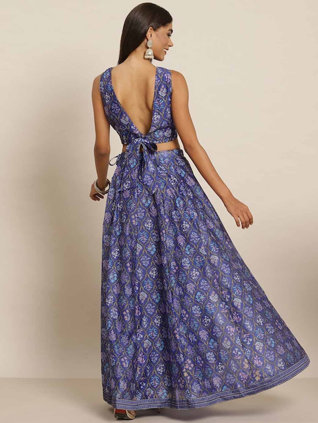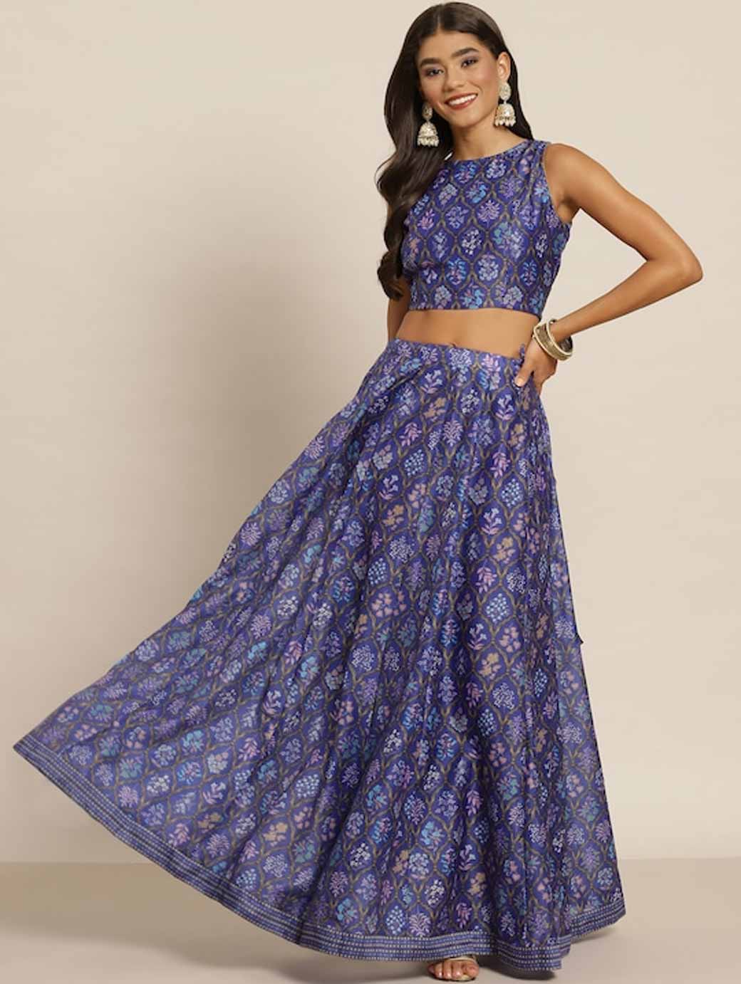 Purple and blue printed ready to wear lehenga, has zip closure, flared hem