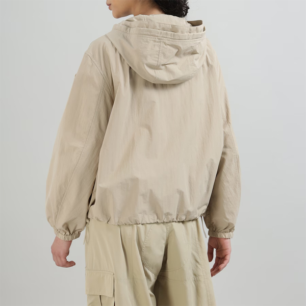 Stay stylish and protected from the elements with this beige hooded jacket. Crafted from durable nylon, it features a convenient zip closure and long sleeves. The solid color makes it easy to pair with any outfit, while the hood provides added coverage. Perfect for transitional weather, this jacket is a must-have addition to your outerwear collection.