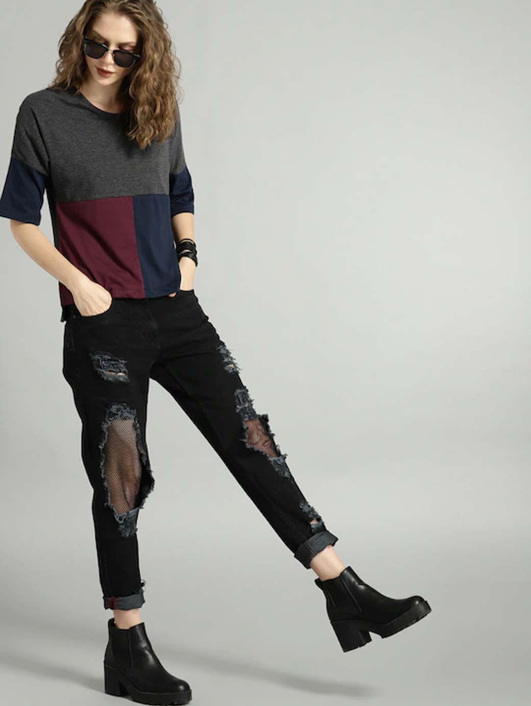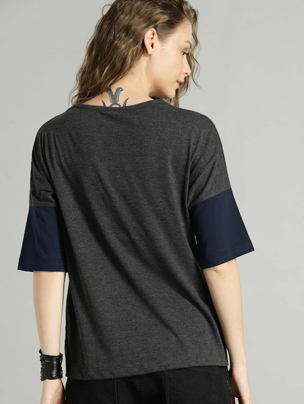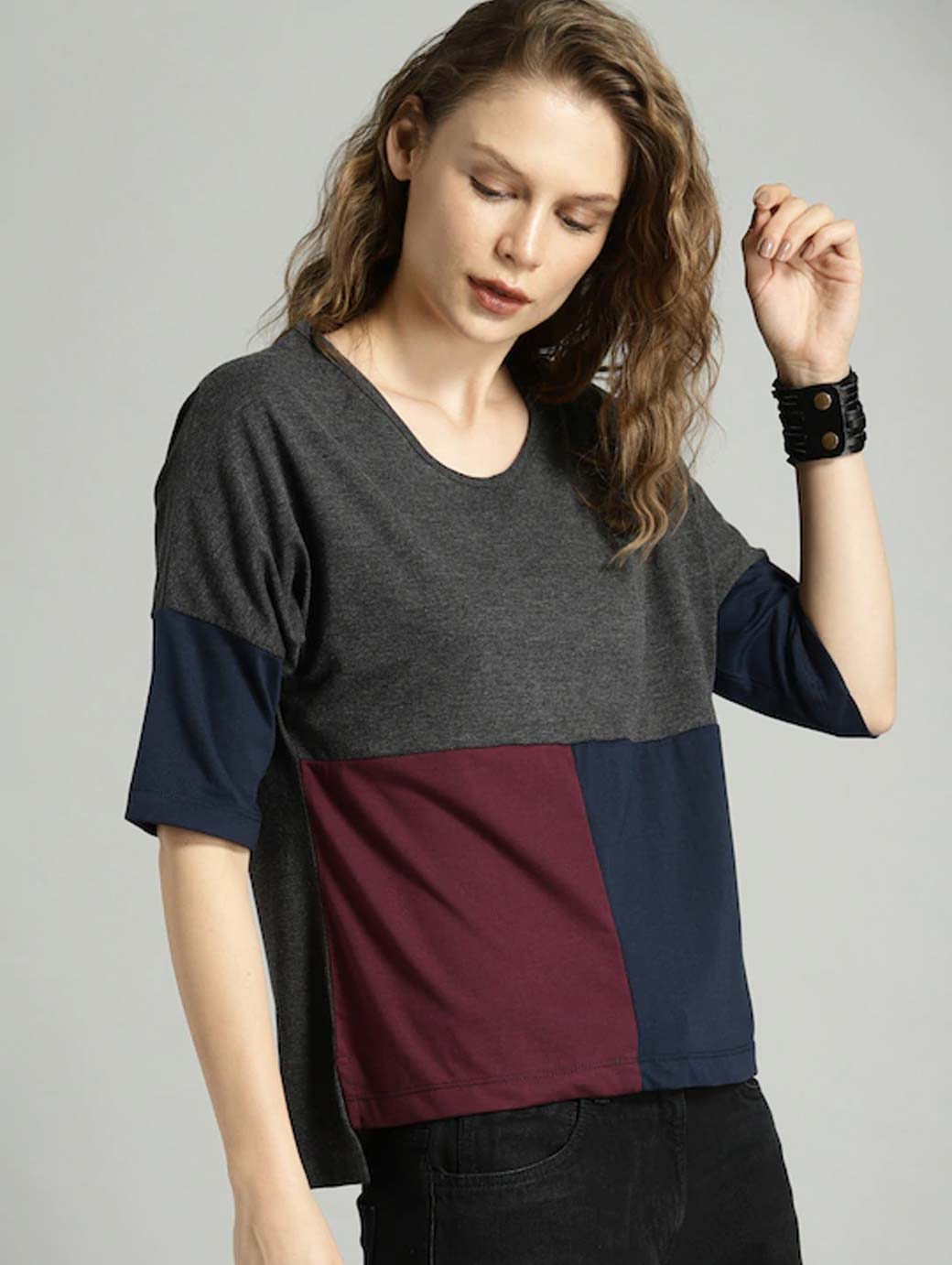 Women Charcoal Grey & Maroon Colourblocked Cotton T-shirt