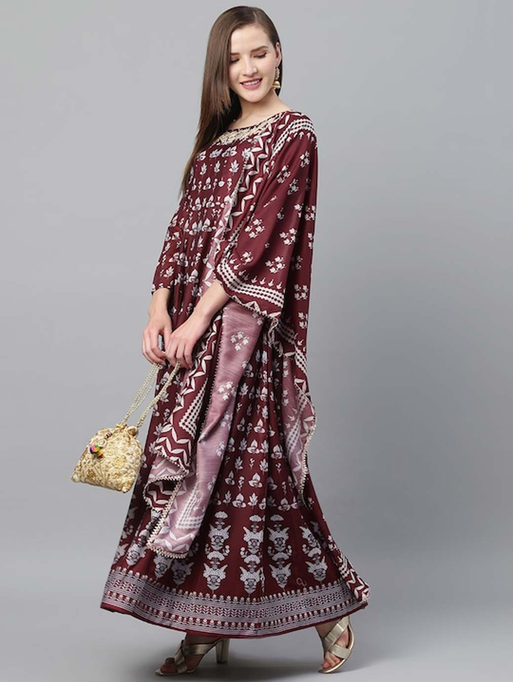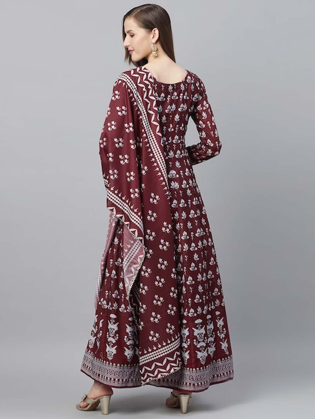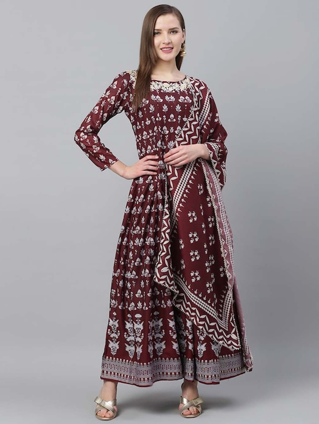 Coffee brown and off-white floral block printed panelled anarkali kurta, has a round neck with gotta patti detail, three-quarter sleeves, and flared hem Comes with a coffee brown nd off-white floral printed dupatta, gotta patti taped border