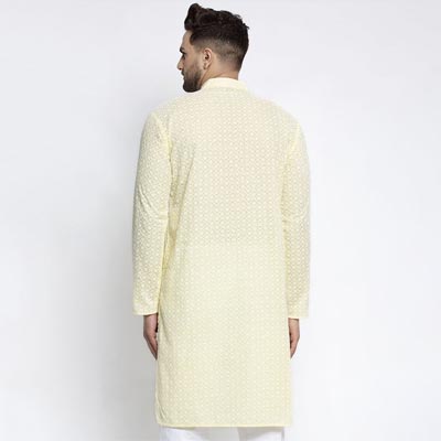Yellow straight shape with long sleeves regular sleeves mandarin collar thread work detail above knee hem regular style machine weave cotton